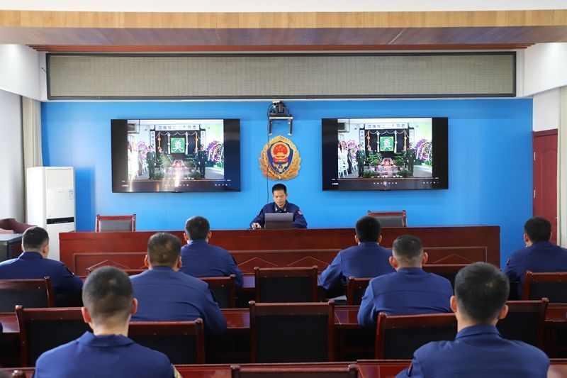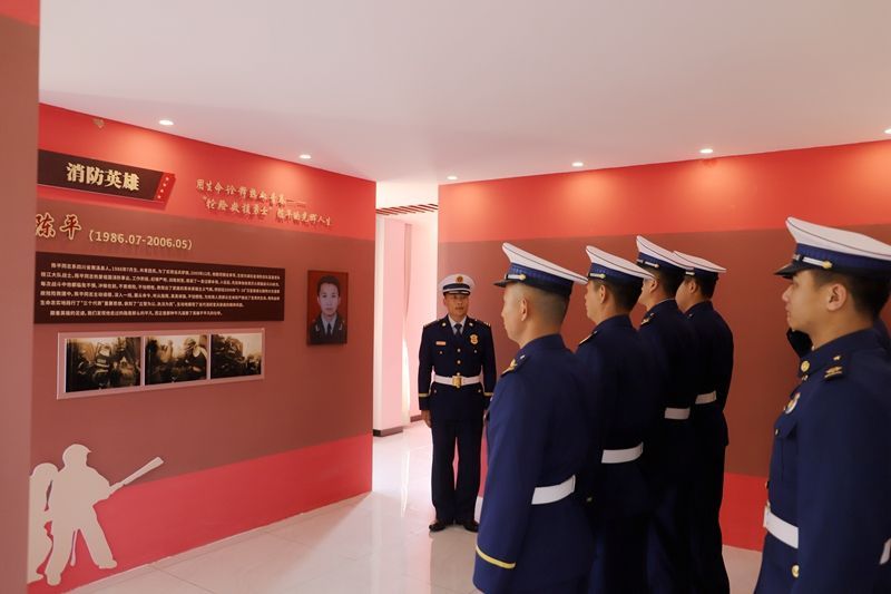 活动中,宣讲员利用课件向全体消防救援人员详细讲述了“5·18”事故救援过程,并通过观看留存的视频、老照片来表达全体消防救援人员对陈平烈士的无限缅怀与哀思。随后,指导员姚伟带领全体消防救援人员来到荣誉室英烈纪念墙前,大家神情肃穆,集体脱帽,向烈士默哀一分钟。